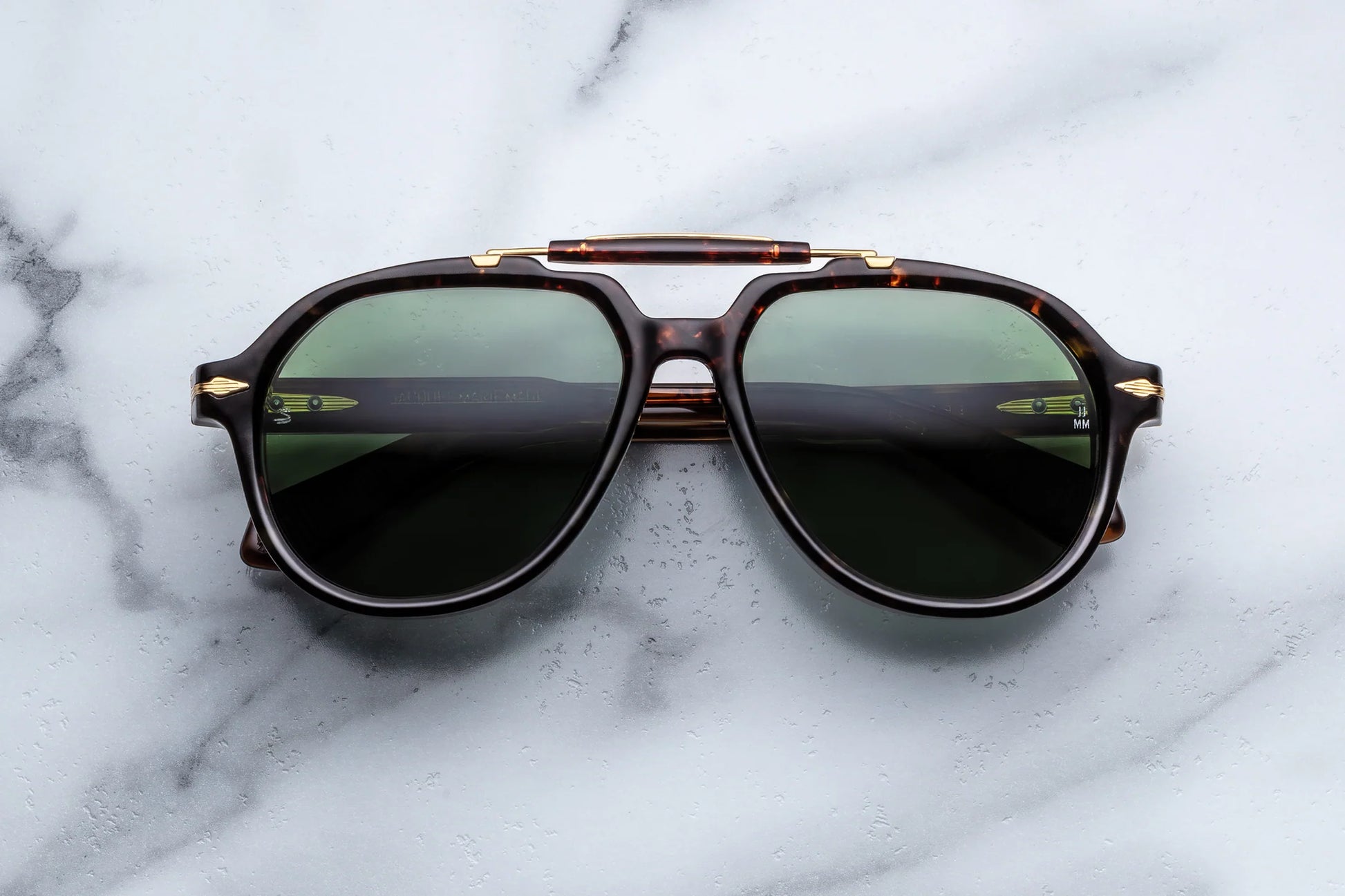 A charismatic ‘90s-inspired aviator handcrafted from cured cellulose acetate, featuring precious metal arrowhead end-piece embellishments, custom 5-barrel hinges, and our signature temple wirecores with refined hairline details.