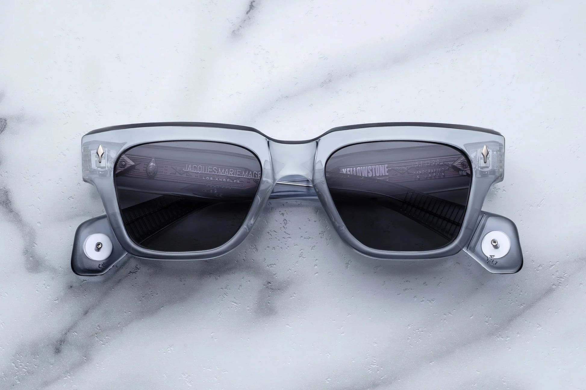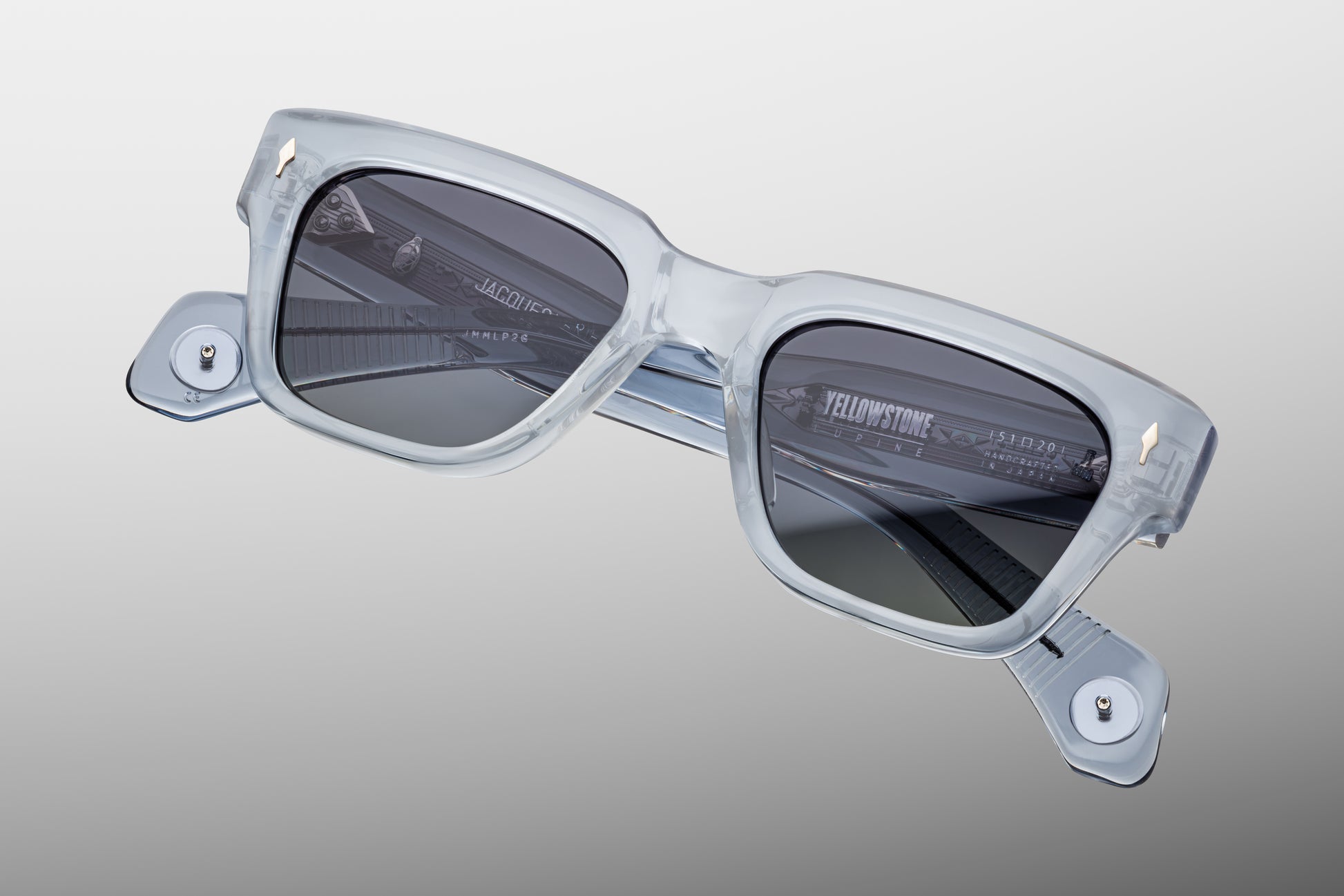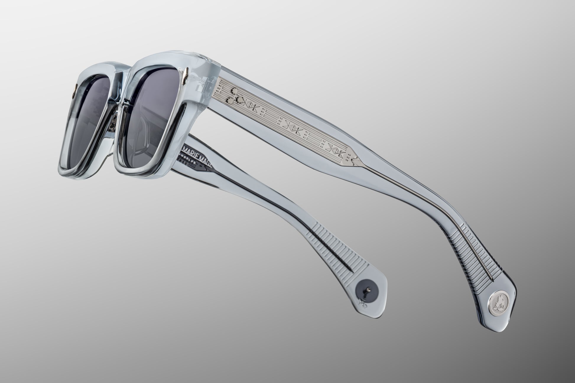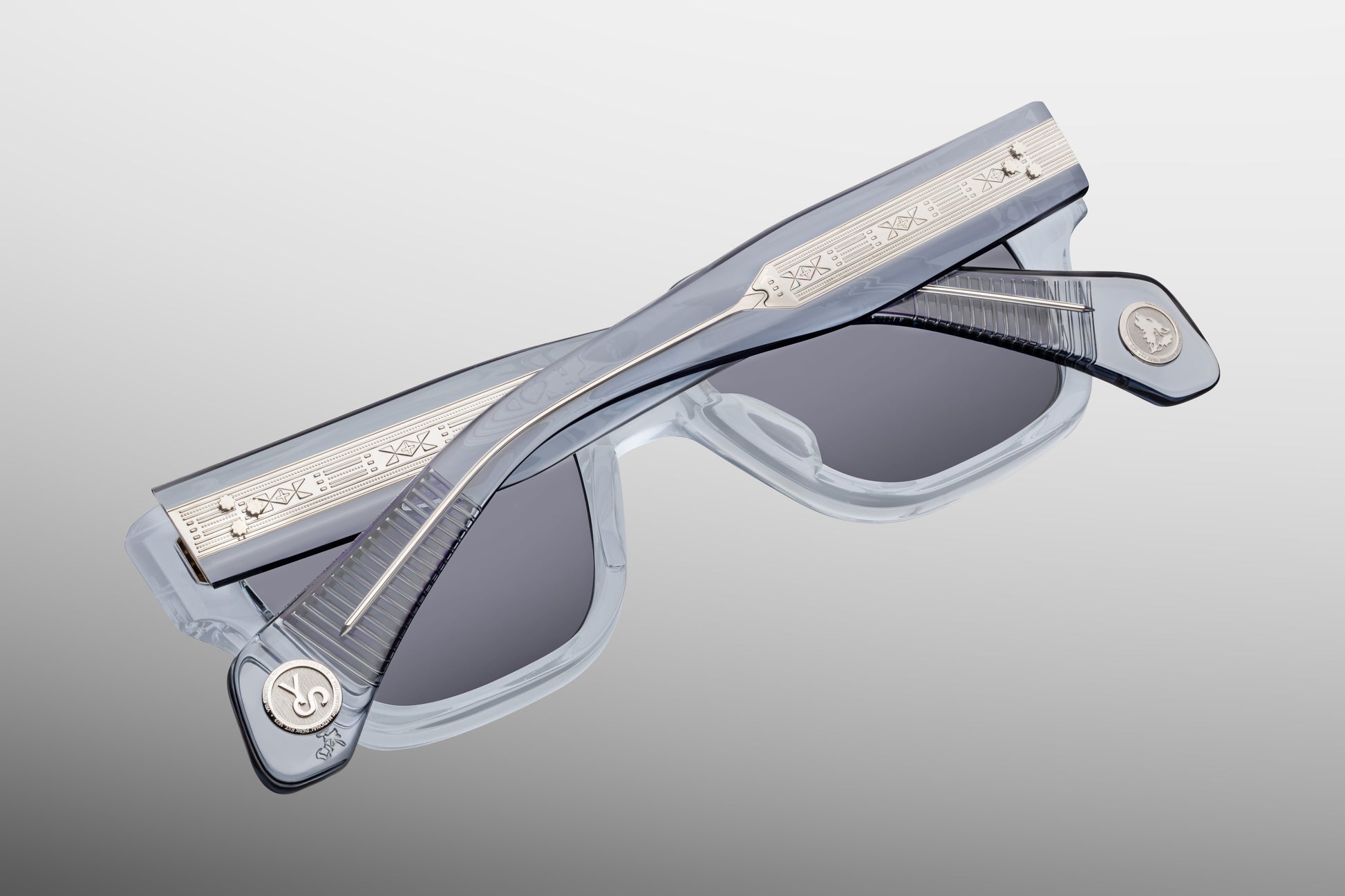 Refined ‘60s-inspired rectangular glasses handcrafted from plant-based acetate in Clear Blue, complemented by our ‘O-Six’ polarized glass lenses in a gradient Wonder gray, exposed hairline-engraved wirecores, and special 'Howling Wolf' and 'YS' medallions at the temple tips.