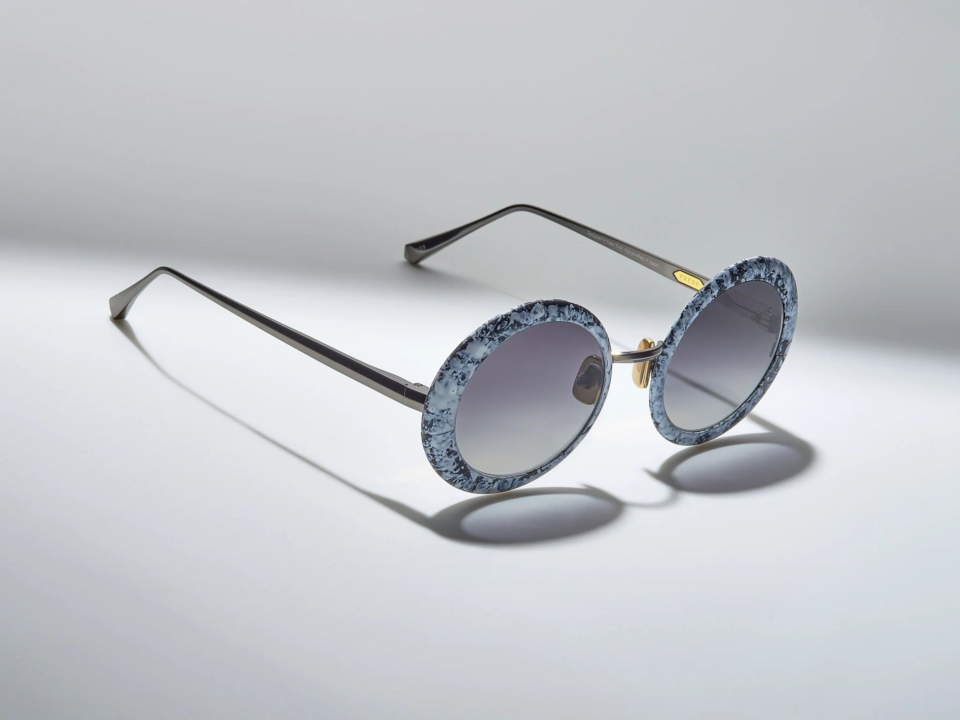 Rounds just found a new dimension. Sculpted and rounded Japanese titanium, Zeiss nylon lenses, OBE spring hinges, platinum and gold plated accents, and custom titanium nose pads all come together to make a frame that is as comfortable as it is bold. The never before seen marble plating is unique on each piece, emulating one of the most beautiful natural materials. All fifty pieces of this style are limited edition and numbered.