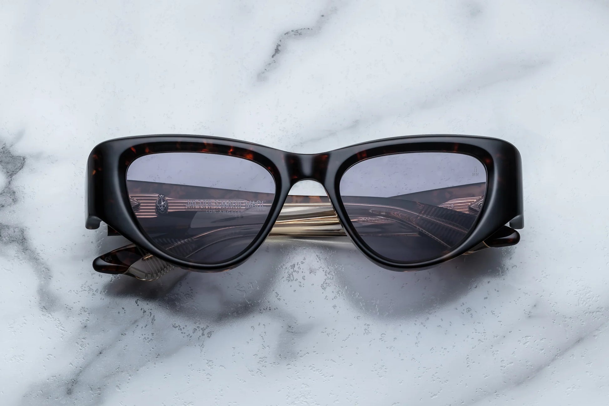 Sultry, medium-sized cat-eye with soft wrap-around, slyly arched brow, alluring V-shaped bridge, and our signature polished metal embellishments.