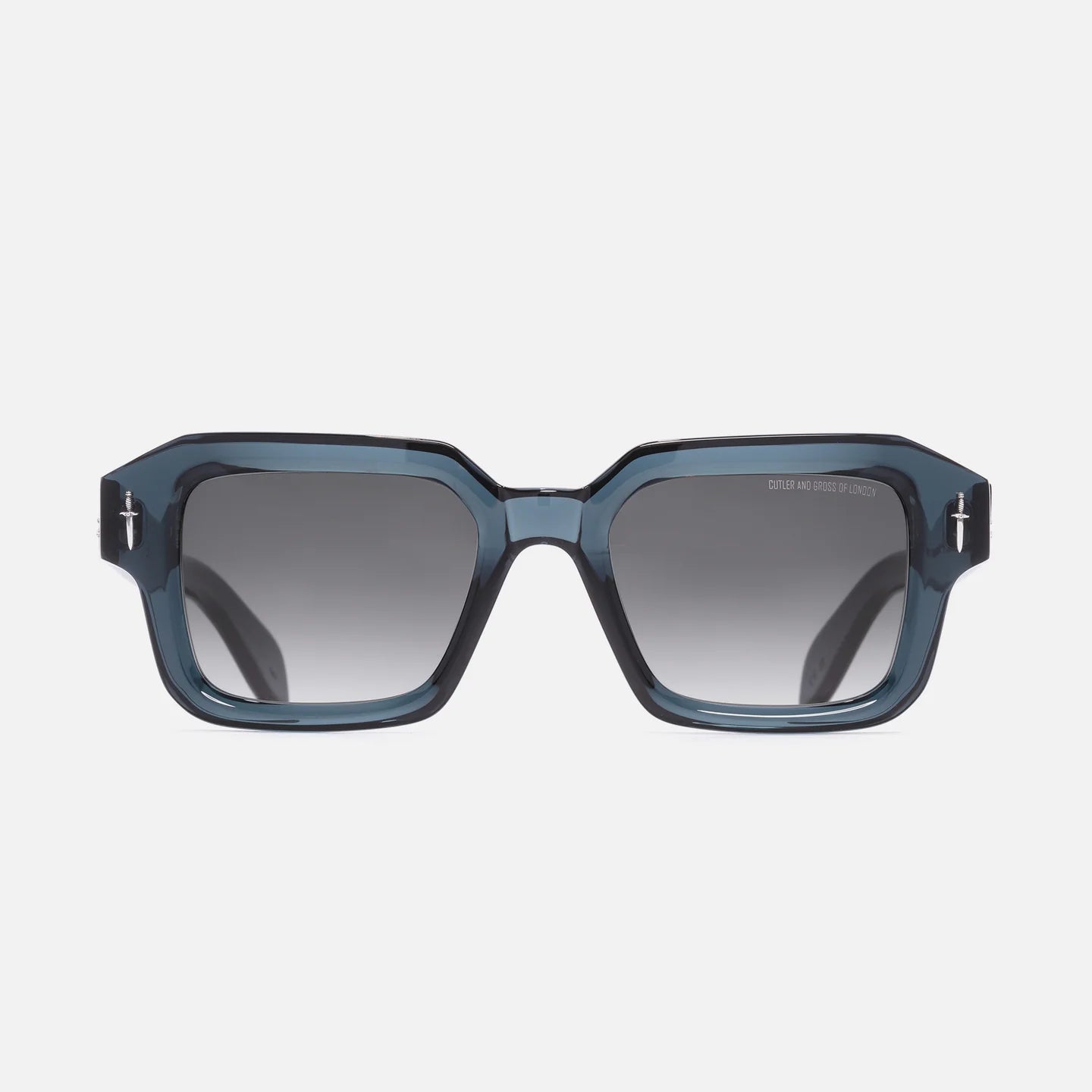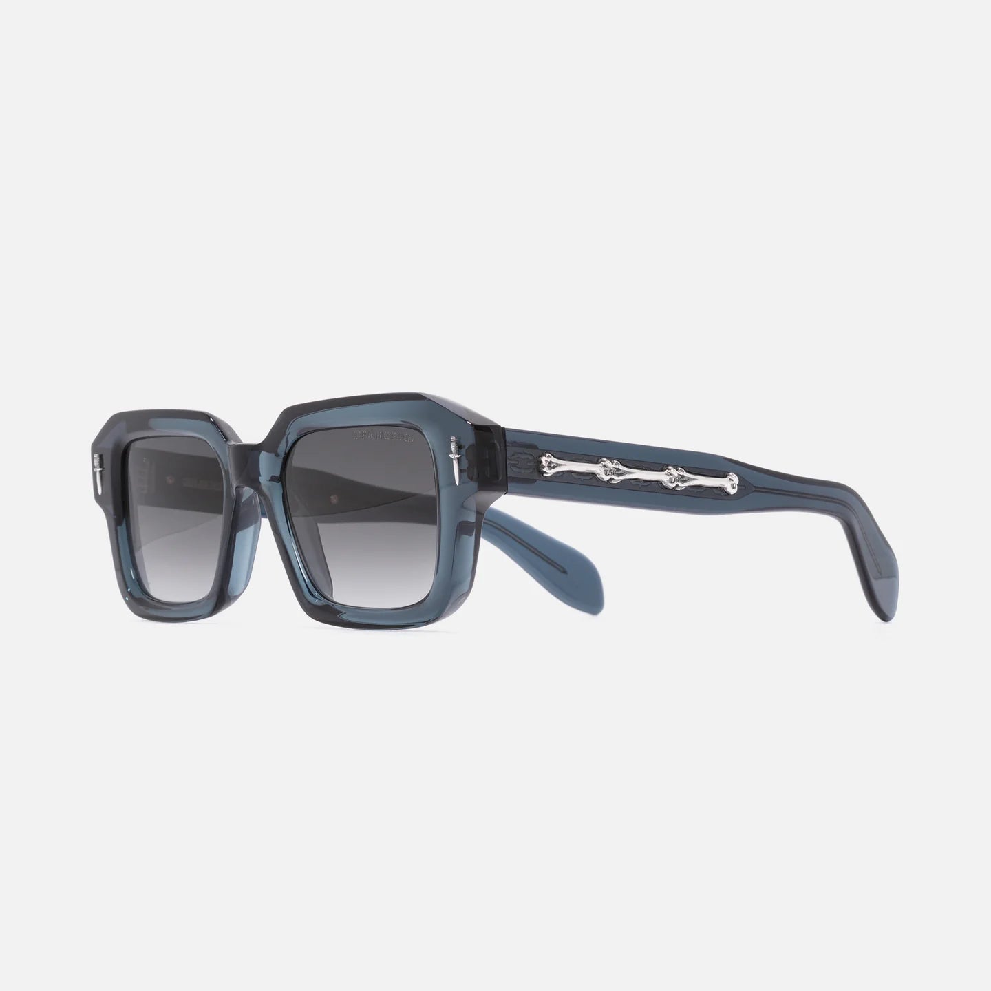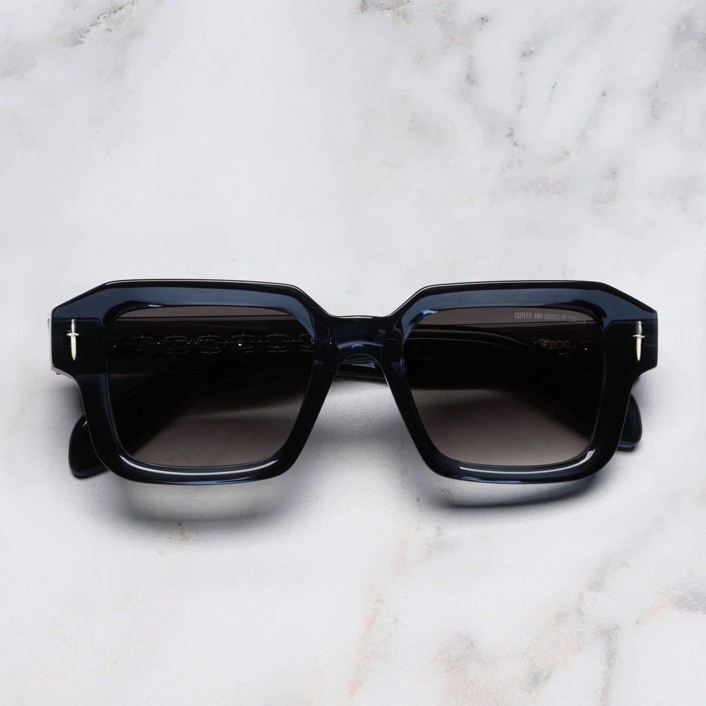 The Great Frog's rock'n'roll jewellery meets Cutler and Gross's acetate artistry with these square sunglasses. Hand cast in Sterling Silver, Bones Link and Dagger emblems gild the temples and frontal. The clean-cut shape is reverse-milled and threaded with Lock Down chain core wire.