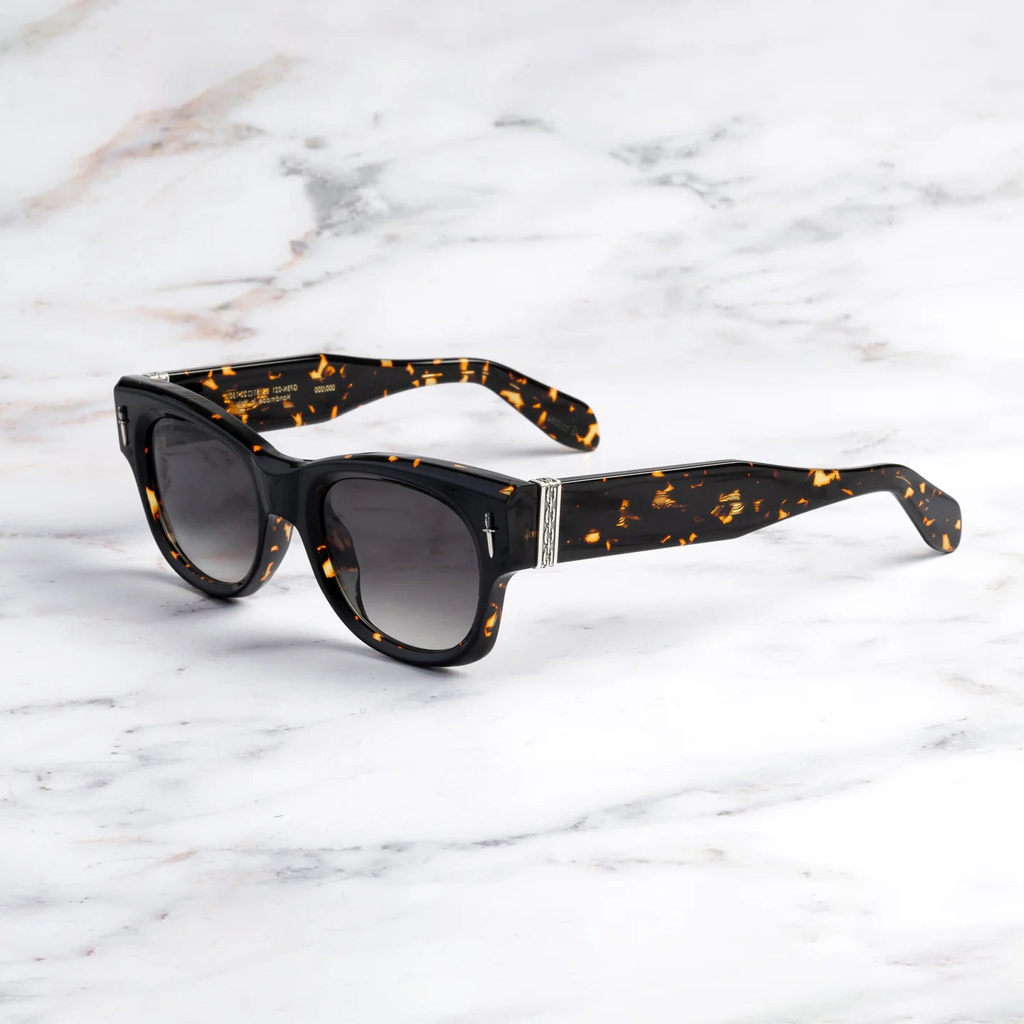 The classic square silhouette takes a darker turn with the Halen sunglass, created in collaboration with The Great Frog. The brand's gothic jewellery has been translated into solid Sterling Silver Dagger and Lock Down Chain emblems gilding the frame. Secured with hex screws, the chunky temples unfold to reveal The Great Frog's logo beneath.